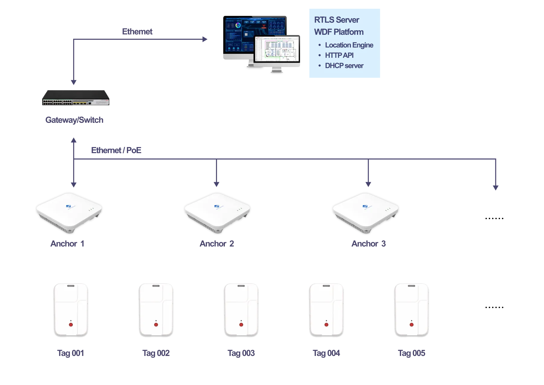 Woxu RTLS platform consists of the Anchors, the Tags and RTLS server, all components connected through the IP network managed by customer. The Anchors accommodate full TCP/IP stack allowing seamless integration of Anchors into the existing IP infrastructure. The IP address of the Anchors may be provided by local DHCP server or preconfigured statically. The configuration and management may be done by accessing the web interface of given Anchors. Powering is done either using mini USB socket or through the Ethernet PoE. In latest release passive PoE is used, therefore intermediate PoE splitters need to be involved in the network. The RTLS Server in addition to Location Engine, HTTP API and Sensmap Framework offers RTLS Manager, web tool that makes the management and update of RTLS devices more easy.