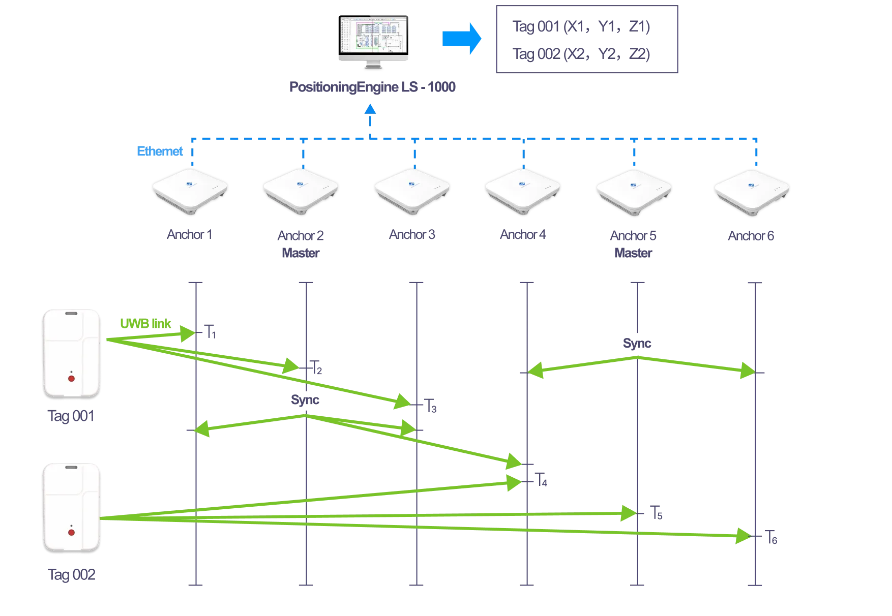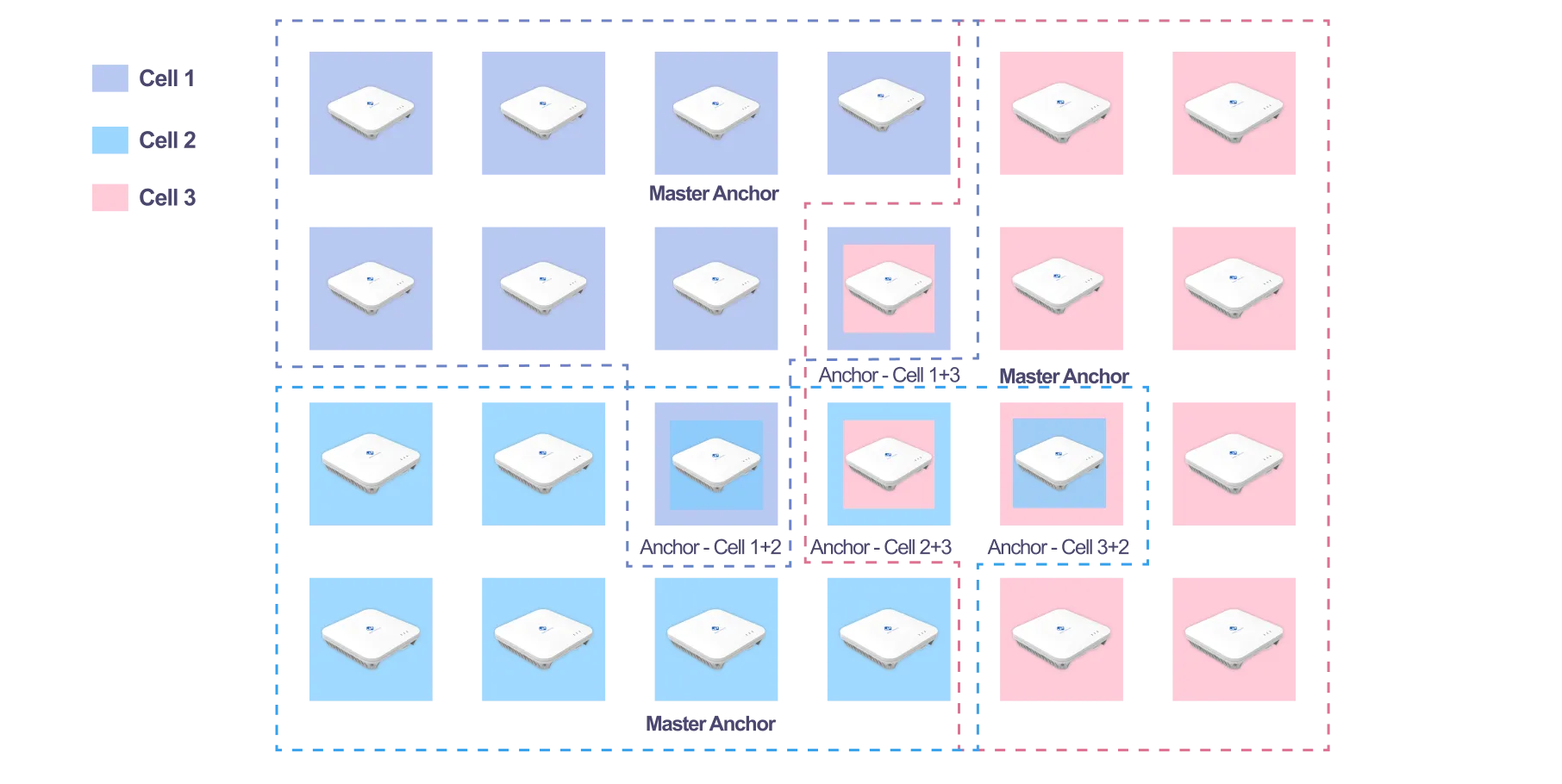 The Tags transmits in regular interval (refresh rate) short Blink message. Such message is processed by all the Anchors in communication range. Regardless their synchronization status, the Anchors send all the timestamps to the RTLS Server through the Ethernet. To calculate position of the Tag, the RTLS Server considers only timestamps coming from at least three Anchors with the same clock base. The synchronization is realized wirelessly, automatically selected Anchors with the optimal coverage called Master Anchors in regular interval broadcast Sync signal. The Anchors in communication range of Master Anchor define cells where all the Anchors are running same clock base for given period of time. It is common that some Anchors are synchronized by more Master Anchors, as depicted below.