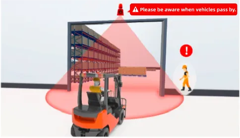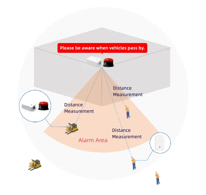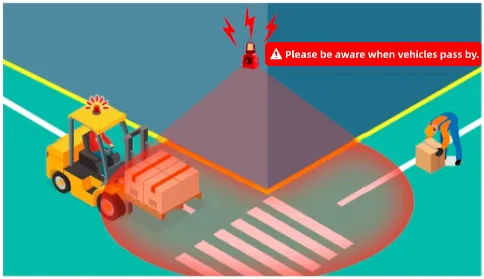 When at least one person and one vehicle or two vehicles are within the safety value of the set alarm area (that is, one person and one vehicle or two vehicles appear in the alarm area simultaneously), the acoustic and optical alarm installed on the wall will give an audible and visual prompt.
