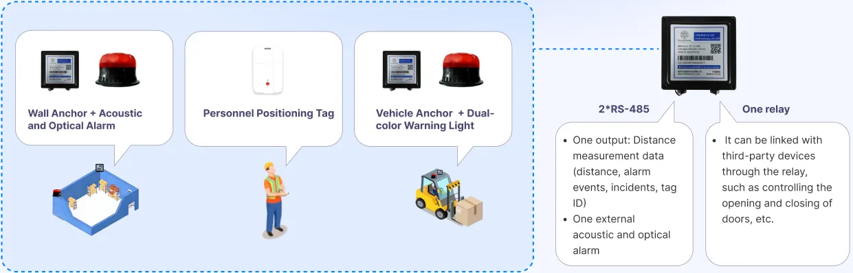 When a person wearing a positioning tag or a vehicle equipped with a anchor enters the effective detection range, real-time distance measurement is performed between the tag/vehicle and the anchor. The system then determines whether to trigger a warning, alarm, or take no action based on the measured distance.